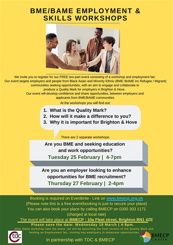 This workshop targets employers seeking to enhance opportunities for Black Asian and Minority Ethnic (BME /BAME inc Refugee / Migrant), with an aim to collaborate to produce a Quality Mark for employers in Brighton & Hove.