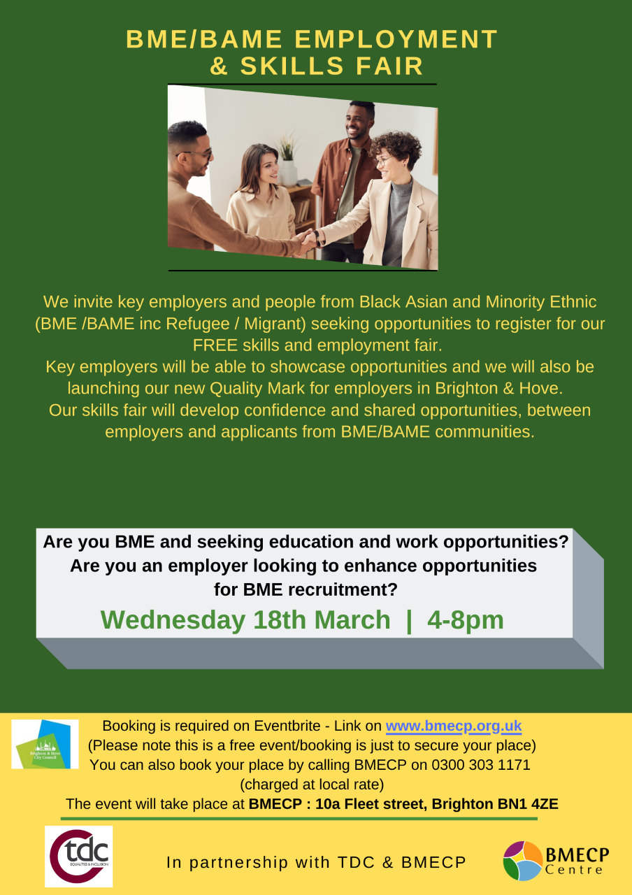 We invite key employers and people from Black, Asian and Minority Ethnic (BME/BAME inc Refugee/Migrant) seeking opportunities to register for our FREE skills and employment fair. Key employers will be able to showcase opportunities and we will also be launching our new Quality Mark for employers in Brighton & Hove.